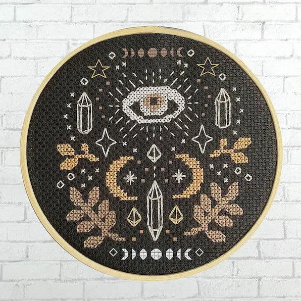 Each cross stitch includes: pattern & instructions, Aida 14 count fabric, DMC threads, 1 DMC needle, wood hoop